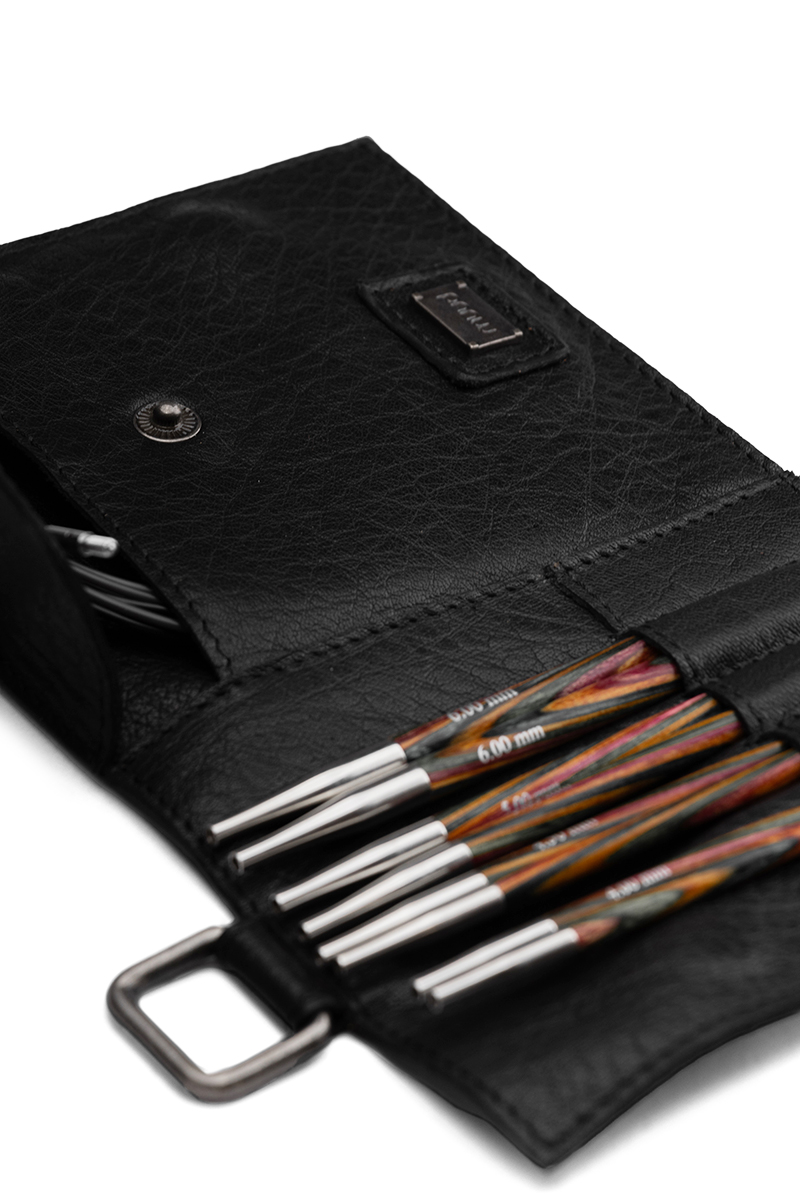 Этот красивый футляр для вязания сочетает в себе стиль и практичность. В Carita B достаточно места для сменных спиц, вязальных спиц и проволоки. В нем помещаются спицы размером от 3 мм до 6 мм в наборах или до 8 мм, если вы храните по одной спице в каждом из самых больших отделений для спиц. Футляр крепится двумя круглыми металлическими кольцами, которые можно прикрепить к футляру Carita.