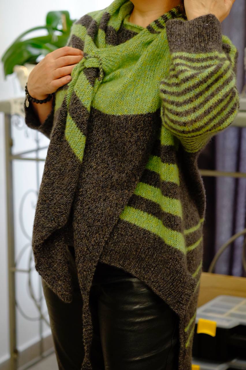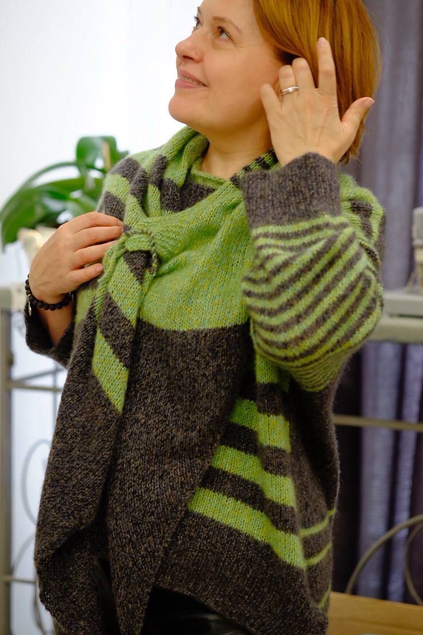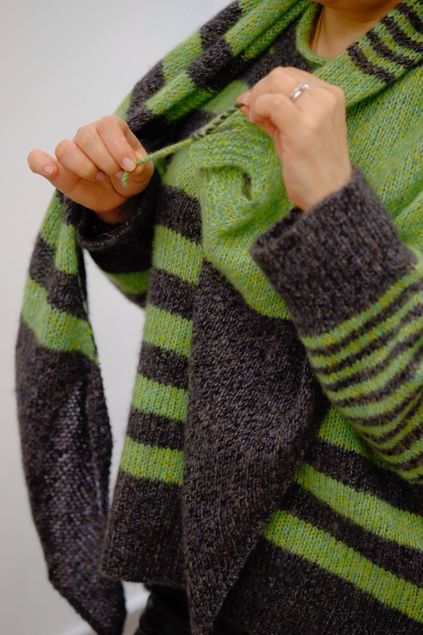 Косынка в дополнение к джемперу или как отдельный самостоятельный аксессуар. Выполняется от угла к углу с расширением и сужением полотна. Для застежки или фиксации косынки есть завязки и петли.