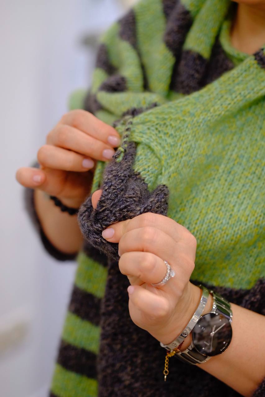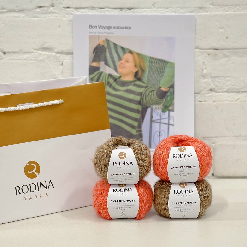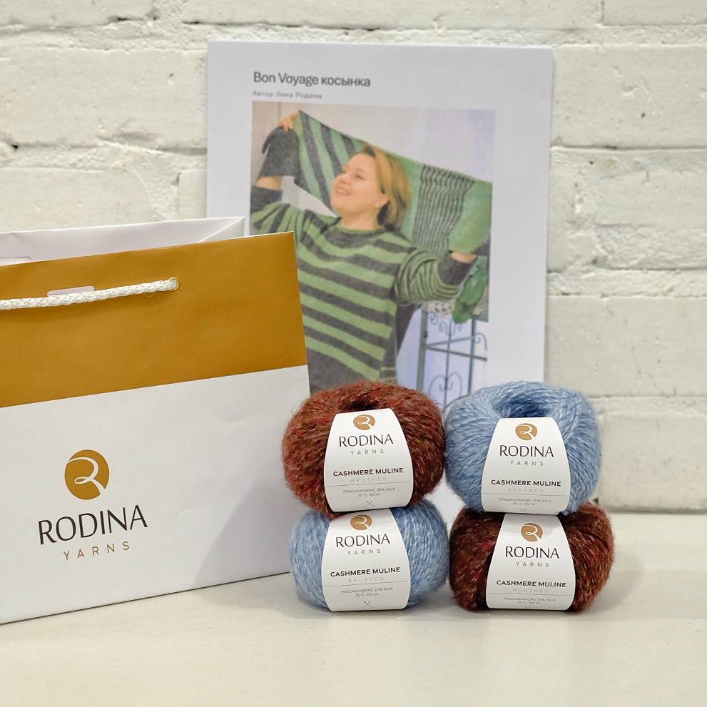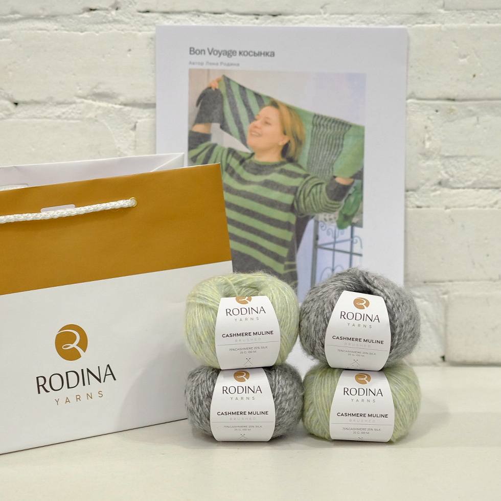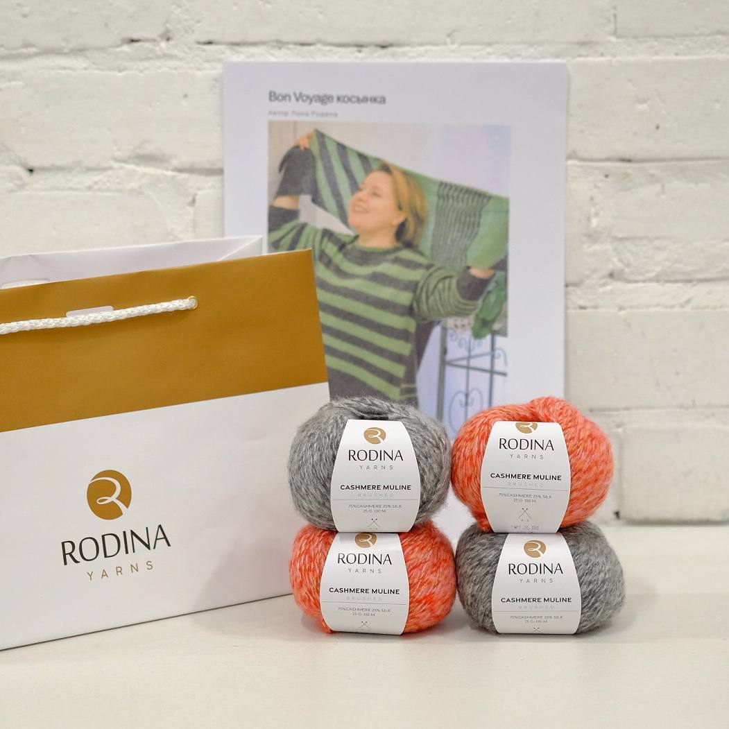 - Пряжа CASHMERE MULINE (75% кашемир, 25% шелк; 25г/100м) двух цветов, в оригинале 26054 ментол/липа – 2 мотка и 26056 темно-серый – 2 мотка. Вес косынки 100 грамм.