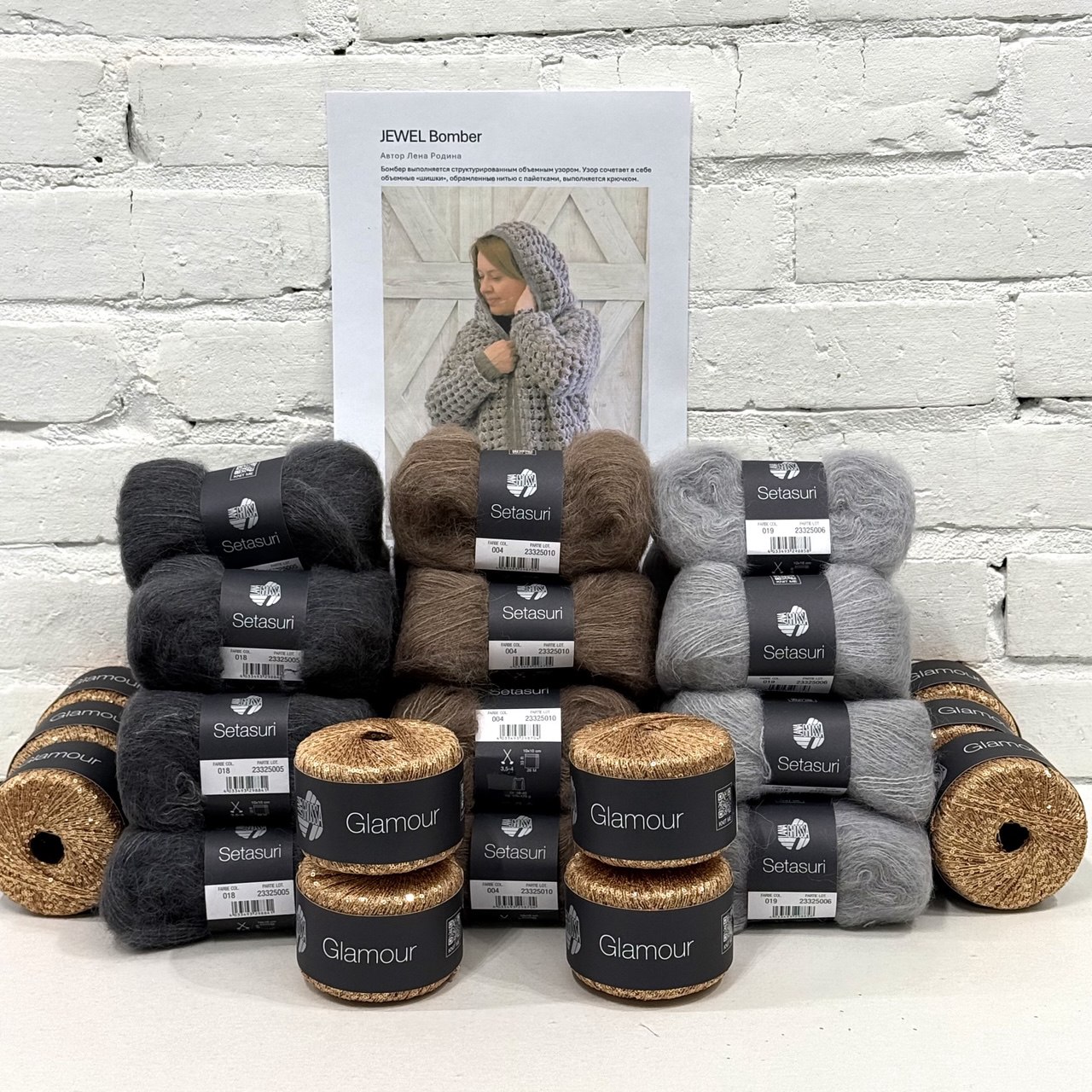 Набор для вязания уникального бомбера в эксклюзивной технике Лены Родиной. В наборе 3 цвета Setasuri по 9 мотков и 10 мотков пряжи Glamour. К набору прилагается напечатанная брошюра 20 стр. Видео по этому узору доступно в закрытом канале автора. В инструкции схема вязания, все этапы, схемы деталей, замеры отдельно по деталям, подробно описаны все этапы сборки и пришивания молнии.