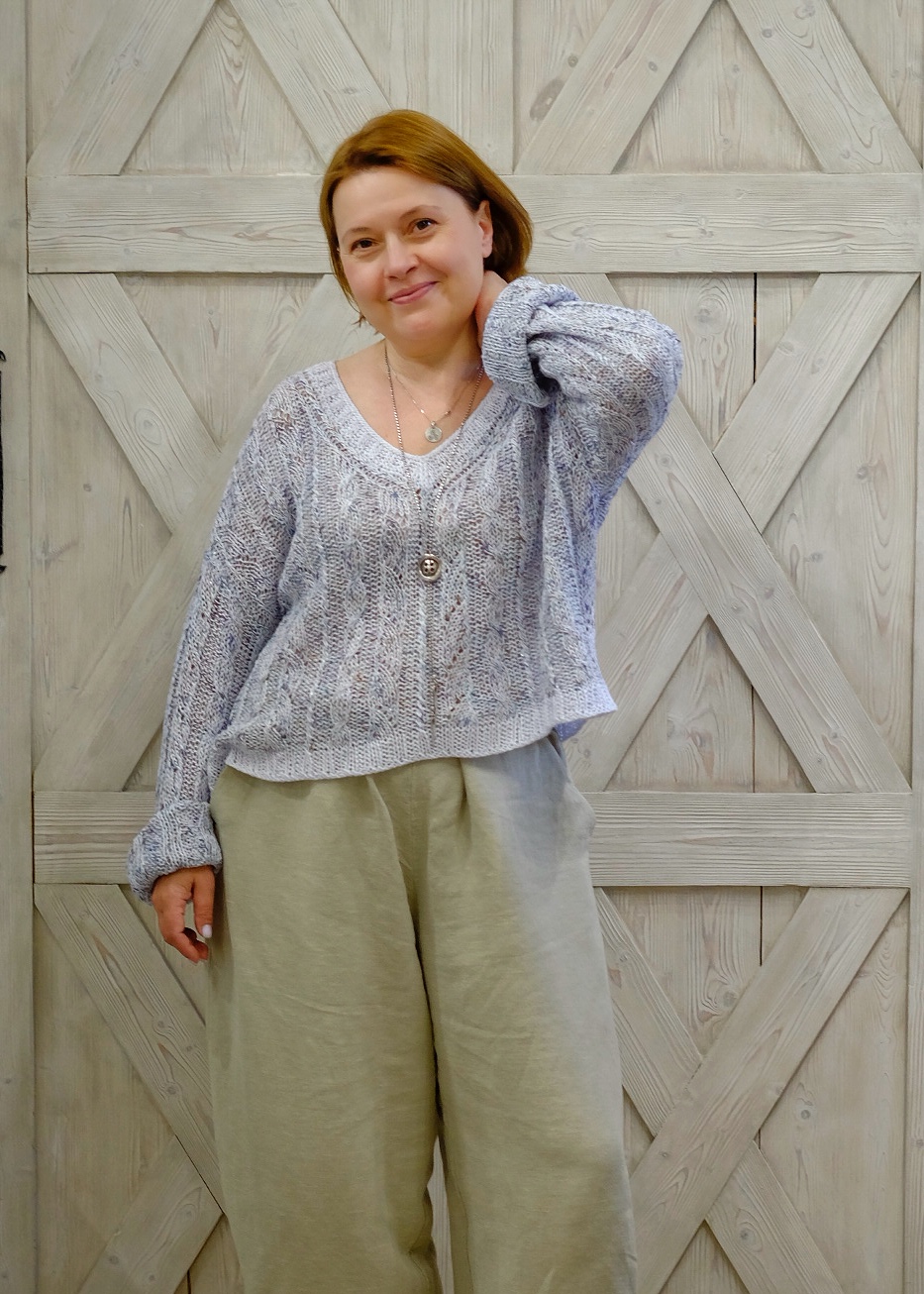 Пуловер выполняется снизу вверх, отдельными деталями. Силуэт прямой, рукав без сужения от проймы вниз. Манжеты контрастные, остальное полотно выполнено в две нити. Сочетание цветной нити SICILIA с пайеткой и льняной основной нити идеально для нарядного летнего пуловера. Ажурный рисунок чередуется с косами, что создает определенный рельеф и игру мерцающих «огоньков».