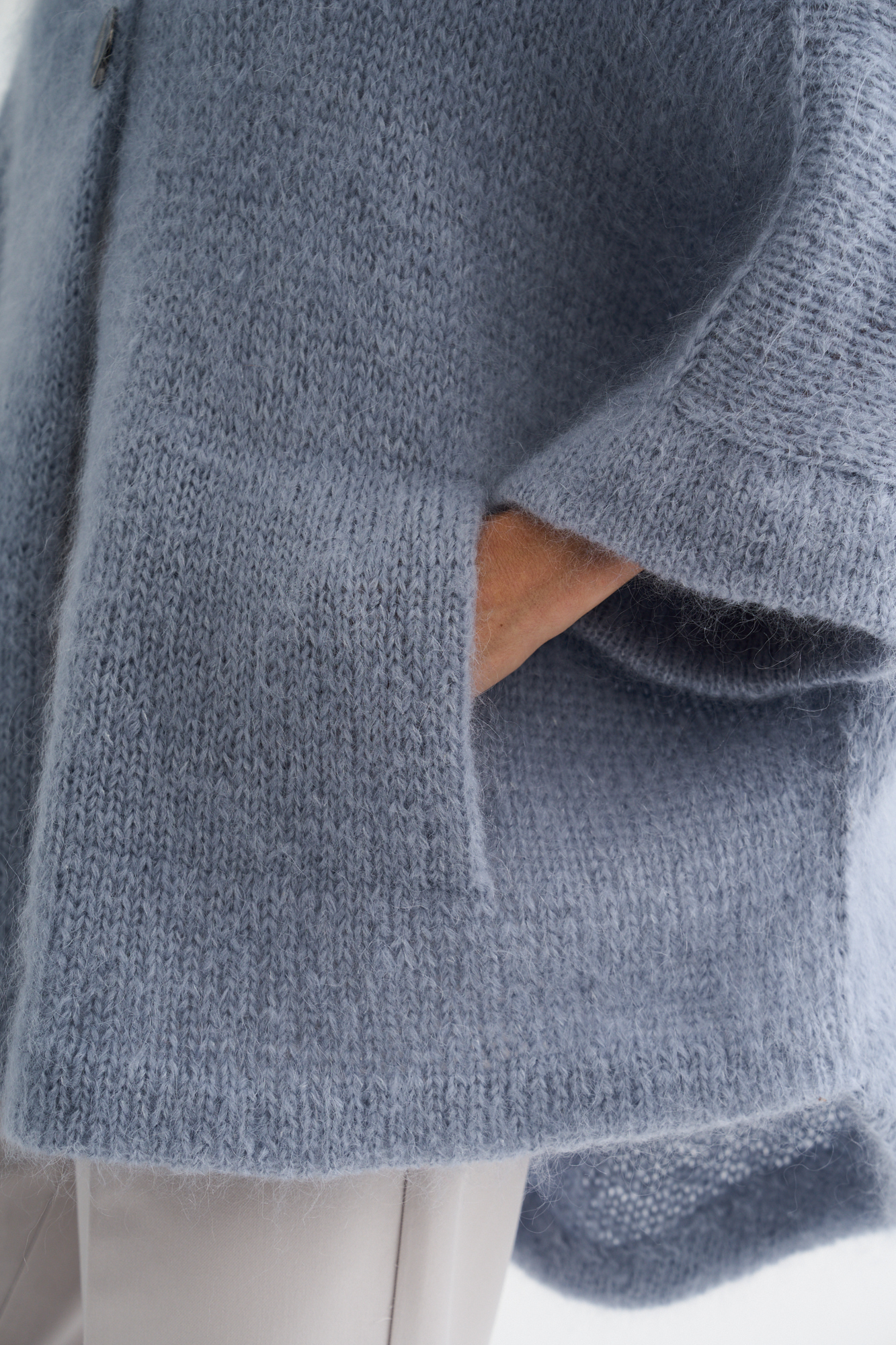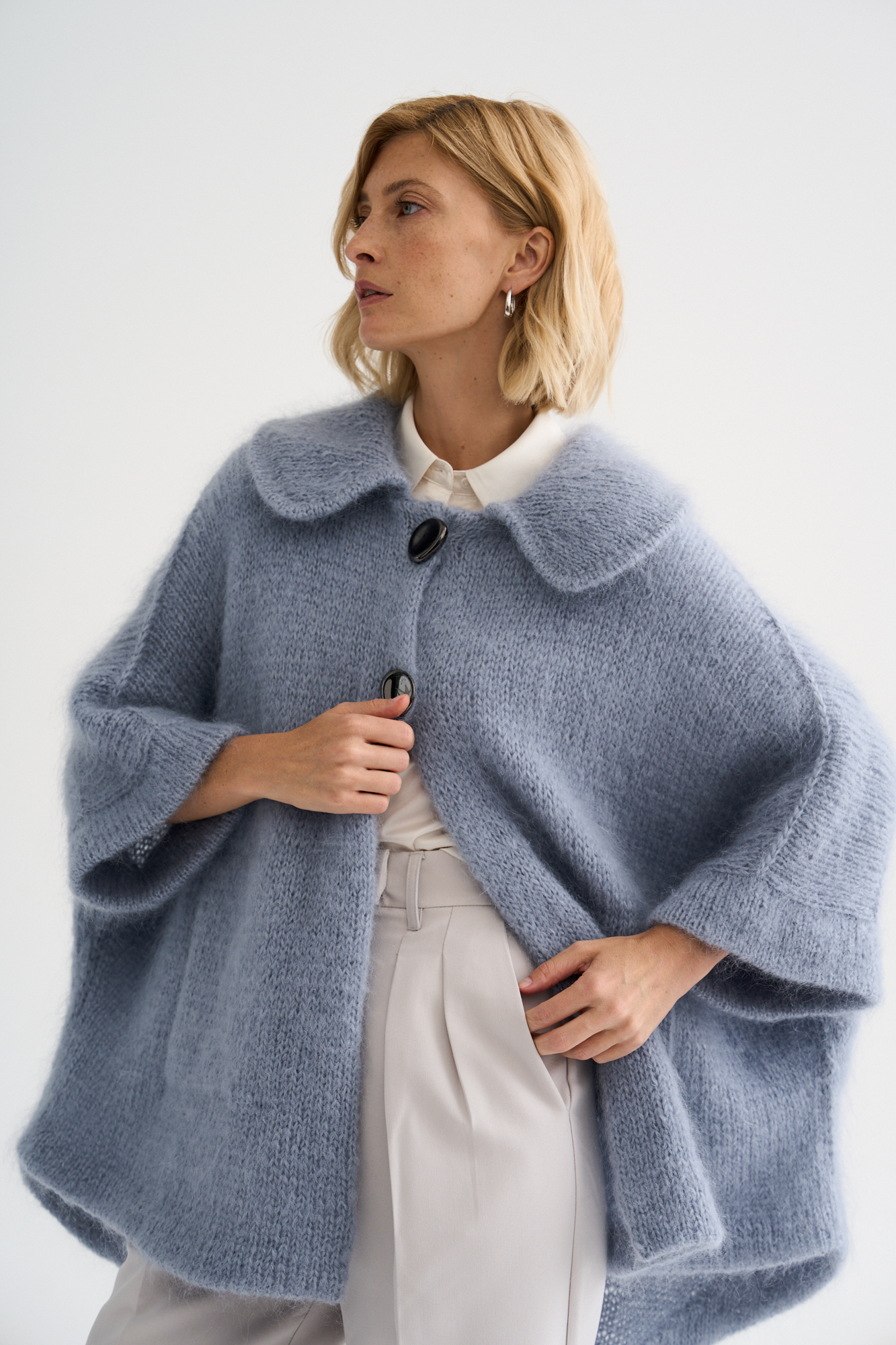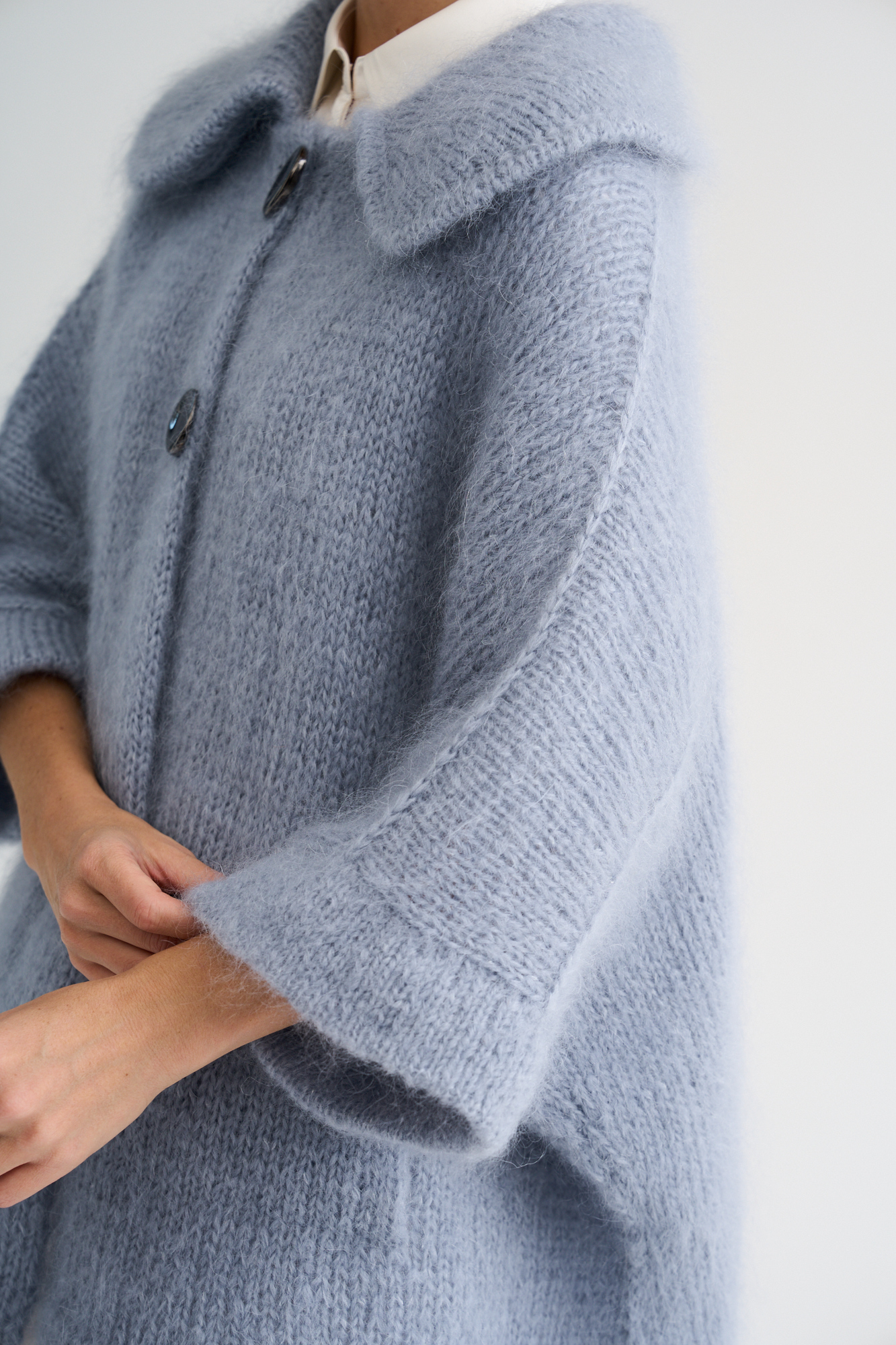 Материалы: потребуется 13 мотков NUVOLA KID (68% мохер, 25% шелк, 7% шерсть мерино; 50г/185м), спицы 4.5 и 5 мм, крючок 5 мм, игла по трикотажу, крючок 3 мм для воротника. 2 пуговицы диаметром 2.5 см.