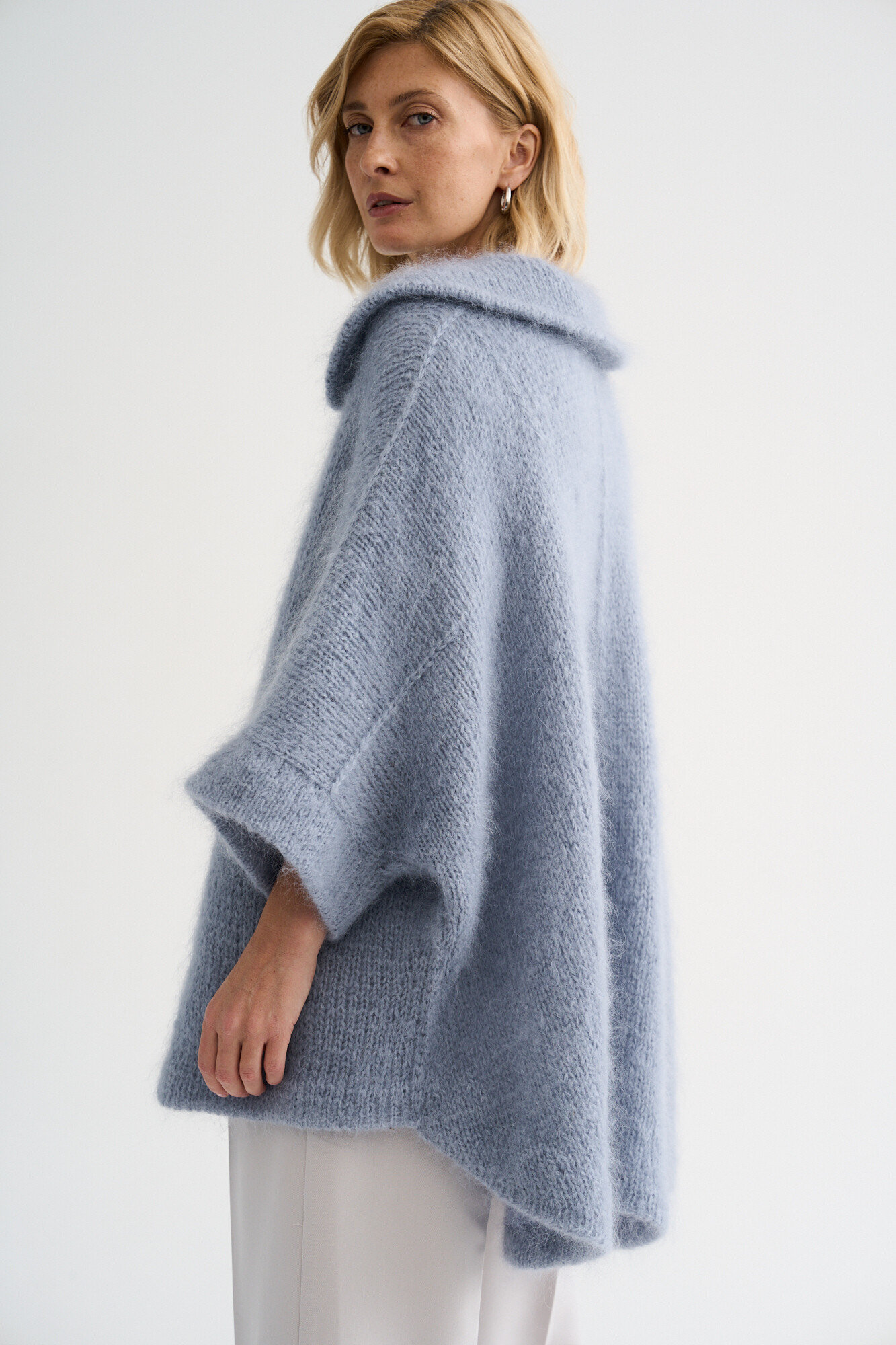 Элегантная накидка выполнена из мохера Nuvola Kid. Оригинальный крой и детали, отлично садится на все типы фигуры, мы протестировали эту модель в группе желающих, для обхвата груди более 120 см и роста выше 170 см была разработана коррекция схем.