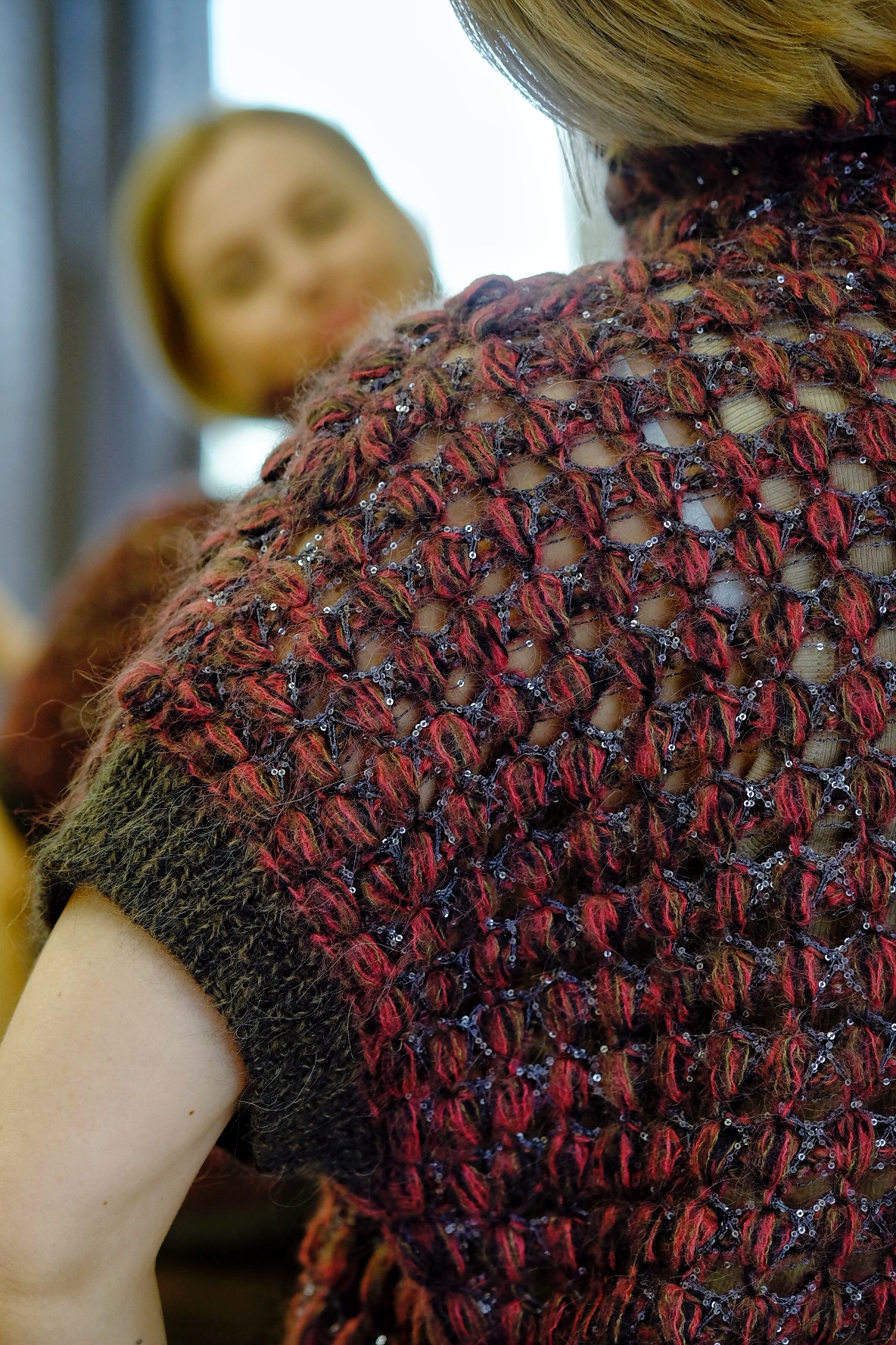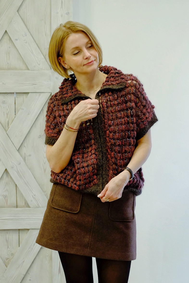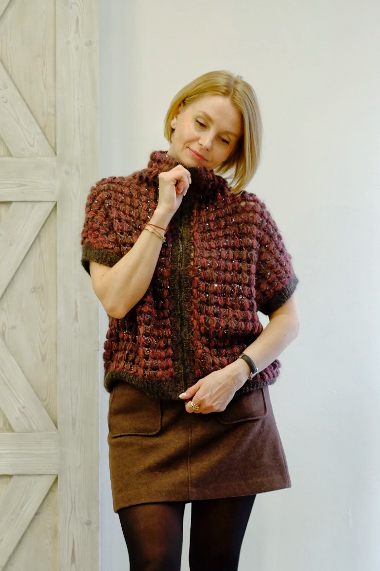 Жилет выполняется структурированным объемным узором JEWEL. Узор сочетает в себе объемные «шишки», обрамленные нитью с пайетками, выполняется крючком.