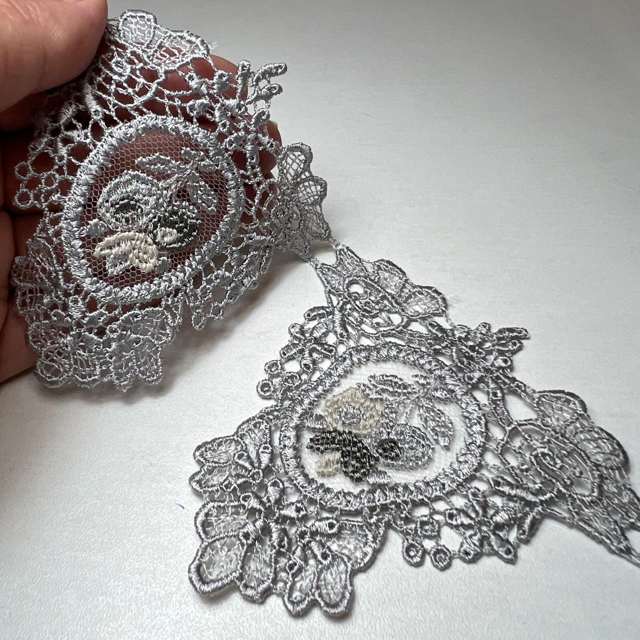 Кружевная тесьма из треугольных мотивов со вставкой аппликации из хлопковой сетки, по которой выполнена вышивка гладью. Мотивы можно использовать как по отдельности (мотивы легко отделить друг от друга), так и в виде тесьмы. Кружево можно ввязать в трикотажное полотно (есть необходимые отверстия).
