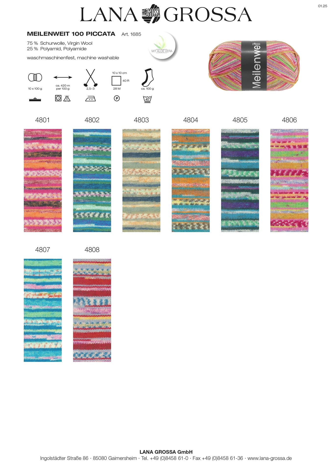 Lana Grossa Meilenweit 100 Piccata сочетает классическое качество с модными цветовыми переходами. Эта 4-ниточная носочная пряжа из шерсти и полиамида отличается прочностью, простотой в уходе и комфортом при носке.