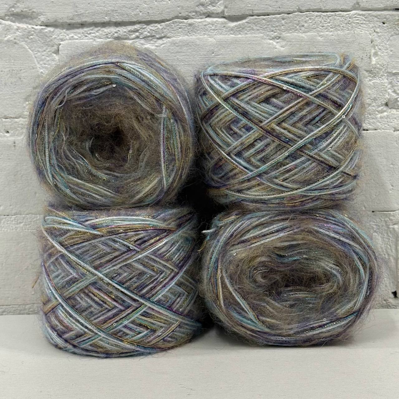 В наборе пряжа преимущественно мохер, с декоративными дополнениями. Пряжа ручной смотки в авторских миксах Rodina Yarns.