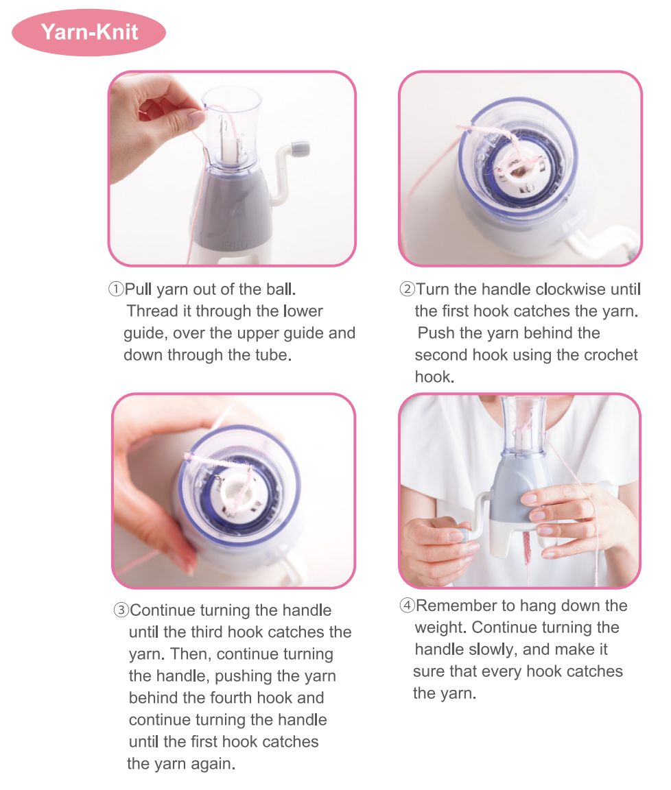 Вязание из пряжи: 1. Достаньте кончик пряжи из клубка. Протяните его через нижнюю направляющую, сверху через верзнюю направляющую и внутрь через трубу, заправьте нить. 2. Крутите ручку по часовой стрелке, до тех пор пока первый крючок не захватит нить. Поместите пряжу перед вторым крючком, используя крючок из набора. 3. Продолжайте крутить ручку до тех пор, пока третий крючок не захватит нить. Затем, продолжайте крутить ручку, поместите нить перед четвертым крючком и продолжайте крутить ручку до тех пор, пока первый крючок не захватит снова нить. 4. Не забудьте подвесить грузик на конец шнура. Продолжайте крутить ручку медленно и убедитесь, что каждый крючок захватывает нить.