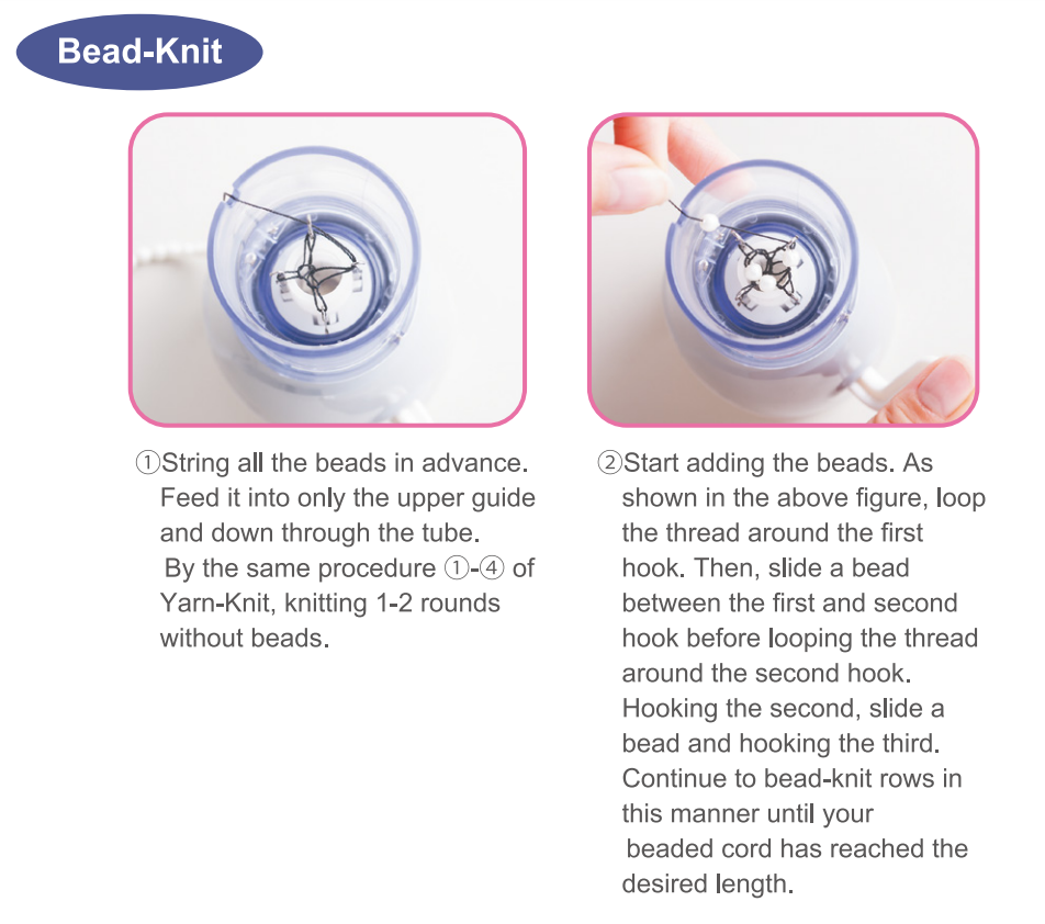Вязание с бусинами: 1. Бусины нужно нанизать на нить заранее. Протяните нить через верхнюю направляющую внутрь тубы. Тем же способом, как и при вязании пряжи, провяжите 1-2 ряда без бусин. 2. Начните добавлять бусины. Как показано на фото, оберните нить вокруг первого крючка. Затем, разместите бусину между первым и вторым крючком до формирование петли вокруг второго крючка. Обкрутили второй, поместите бусину и обкрутите третий. Продолжайте вязание с бусинами тем же способом до тех пор, пока ваш шнур не достигнет желаемой длины.